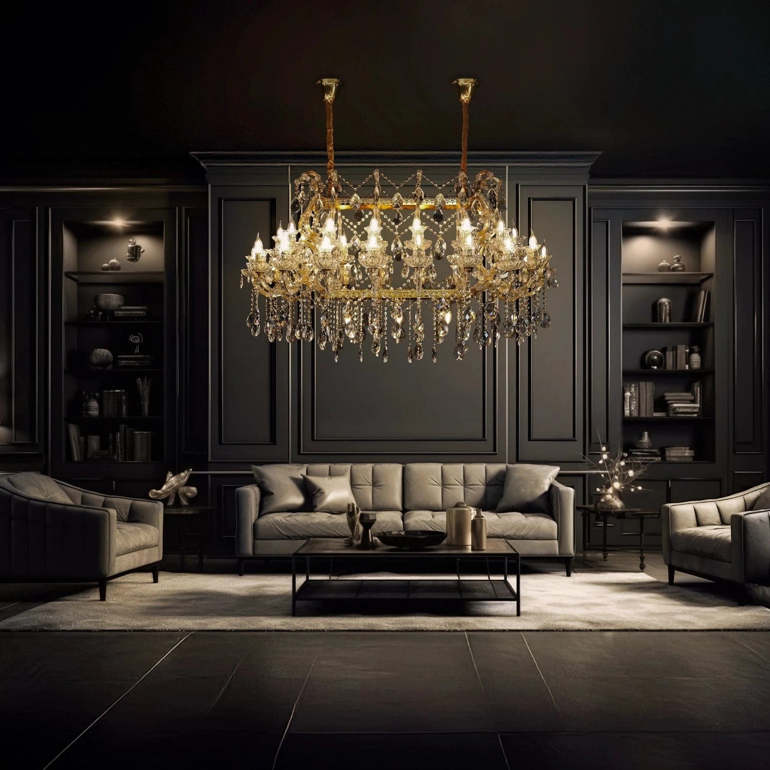 • Multi-tiered crystal arrangement creates a cascading lighting effect for heightened drama and depth.
