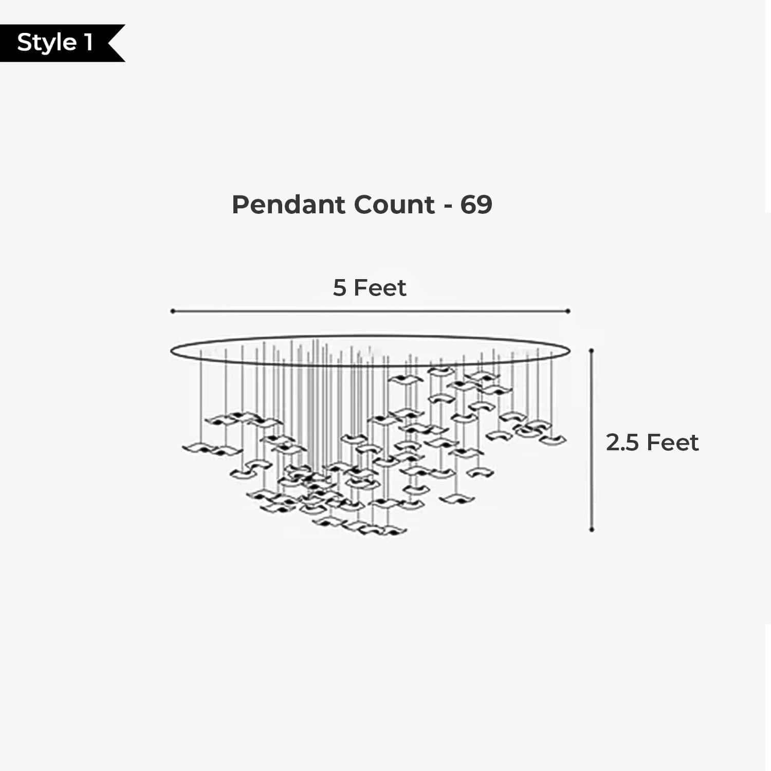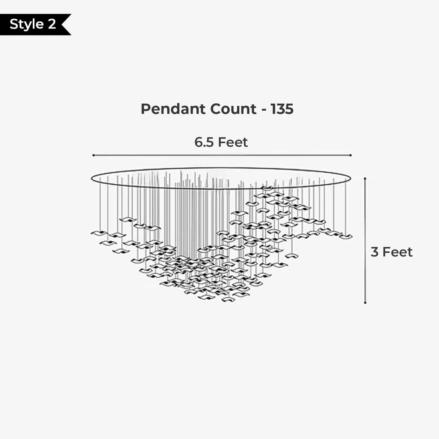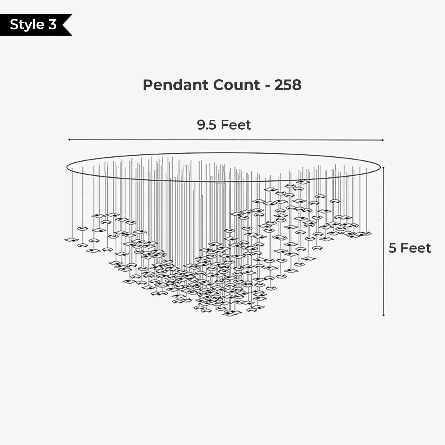 • Available in multiple sizes to suit both compact and large double-height areas — with pendant counts of 69, 135, 258, and 285, and diameters from 2.5 feet to 9.5 feet.