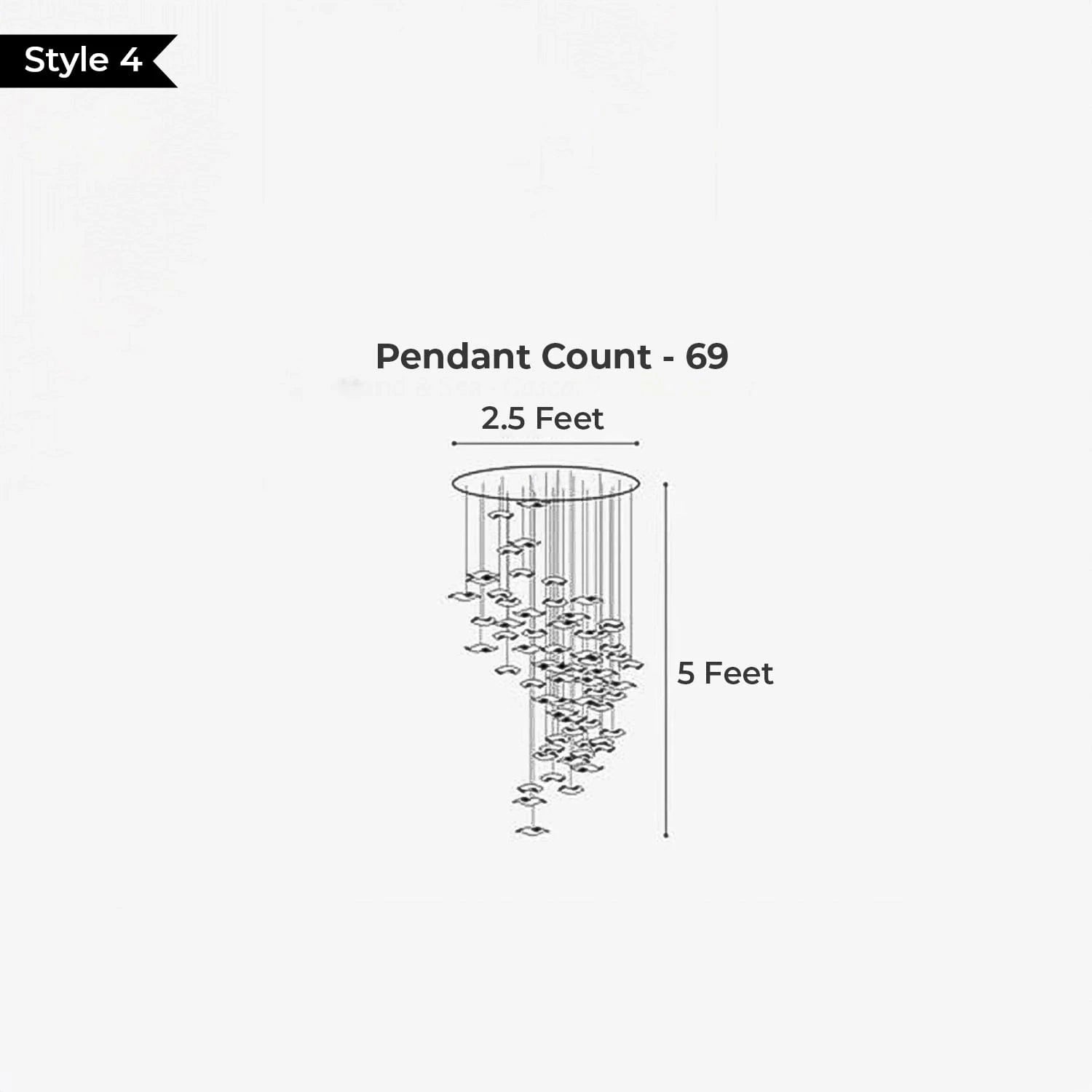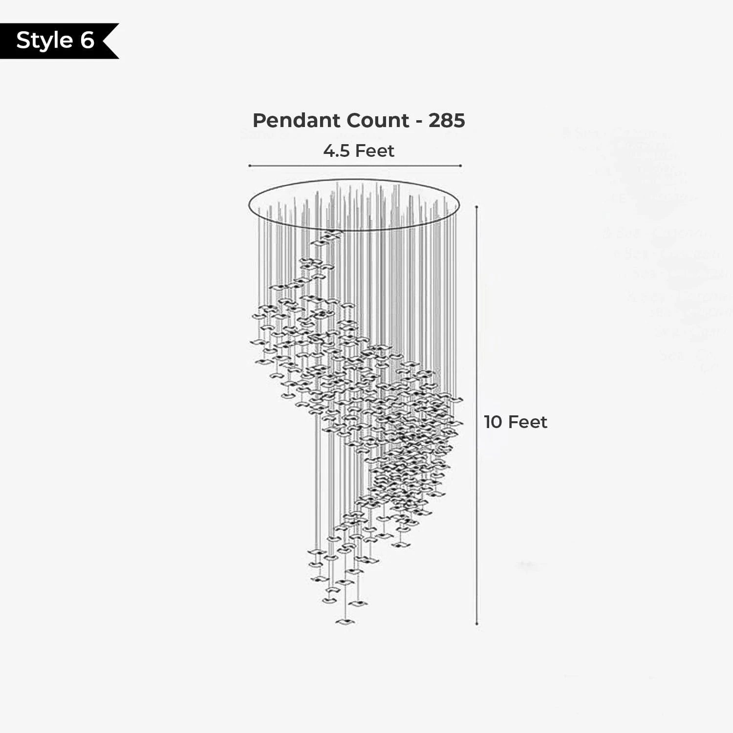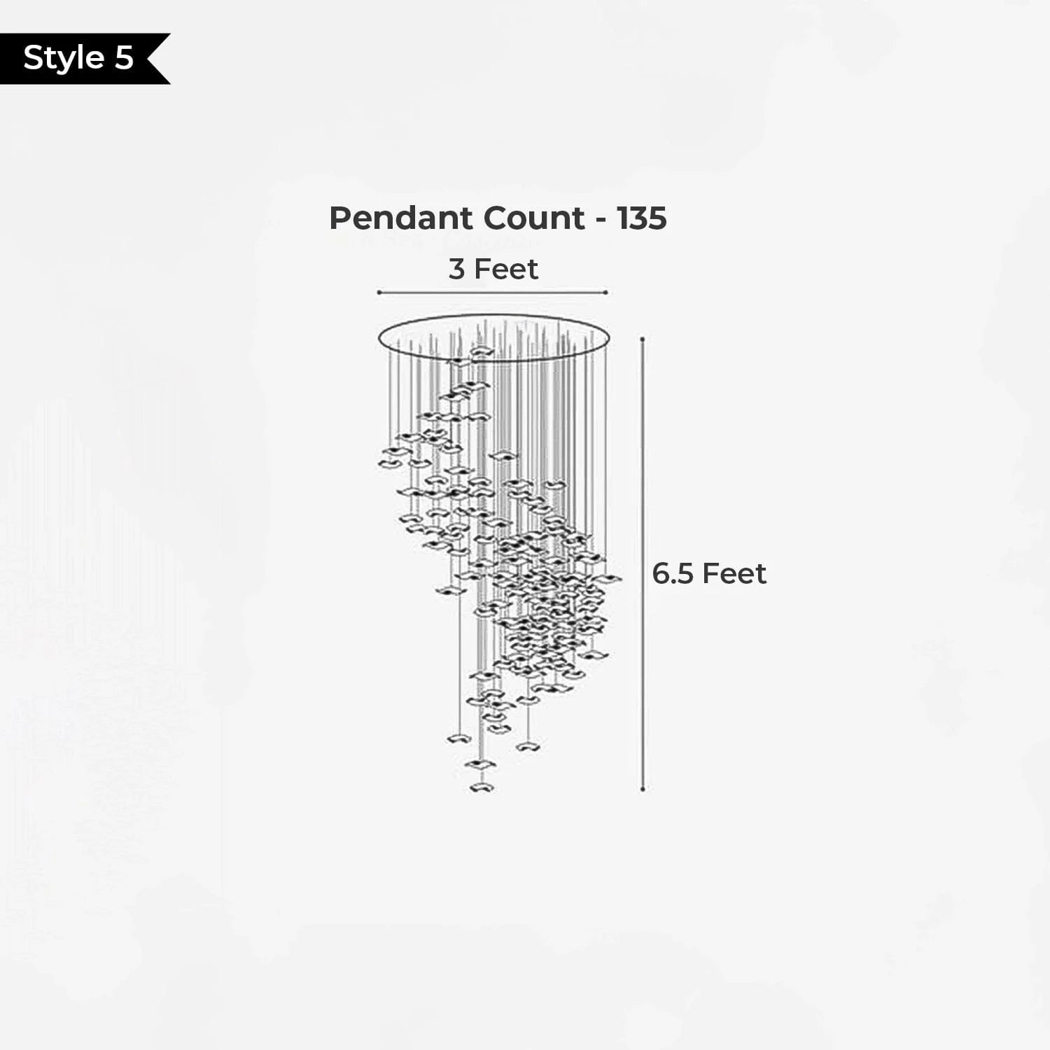 • Available in multiple sizes to suit both compact and large double-height areas — with pendant counts of 69, 135, 258, and 285, and diameters from 2.5 feet to 9.5 feet.
