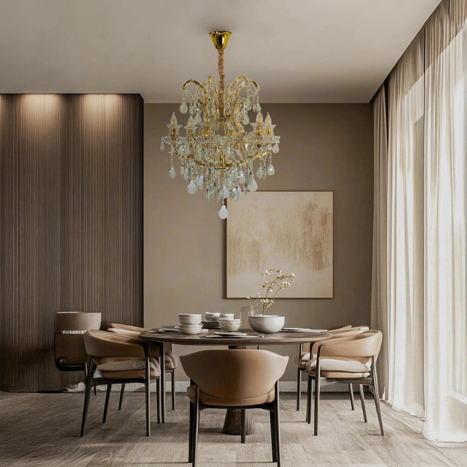 • Balanced Proportions — symmetrical arms and tiered crystal drops create a harmonious chandelier silhouette.