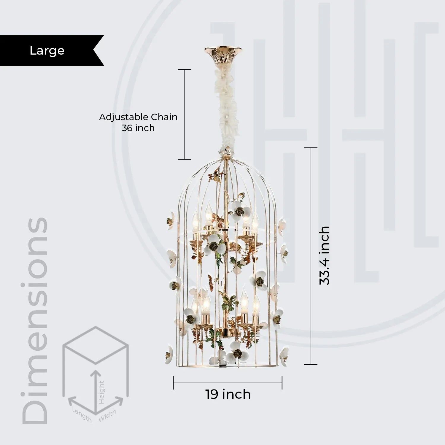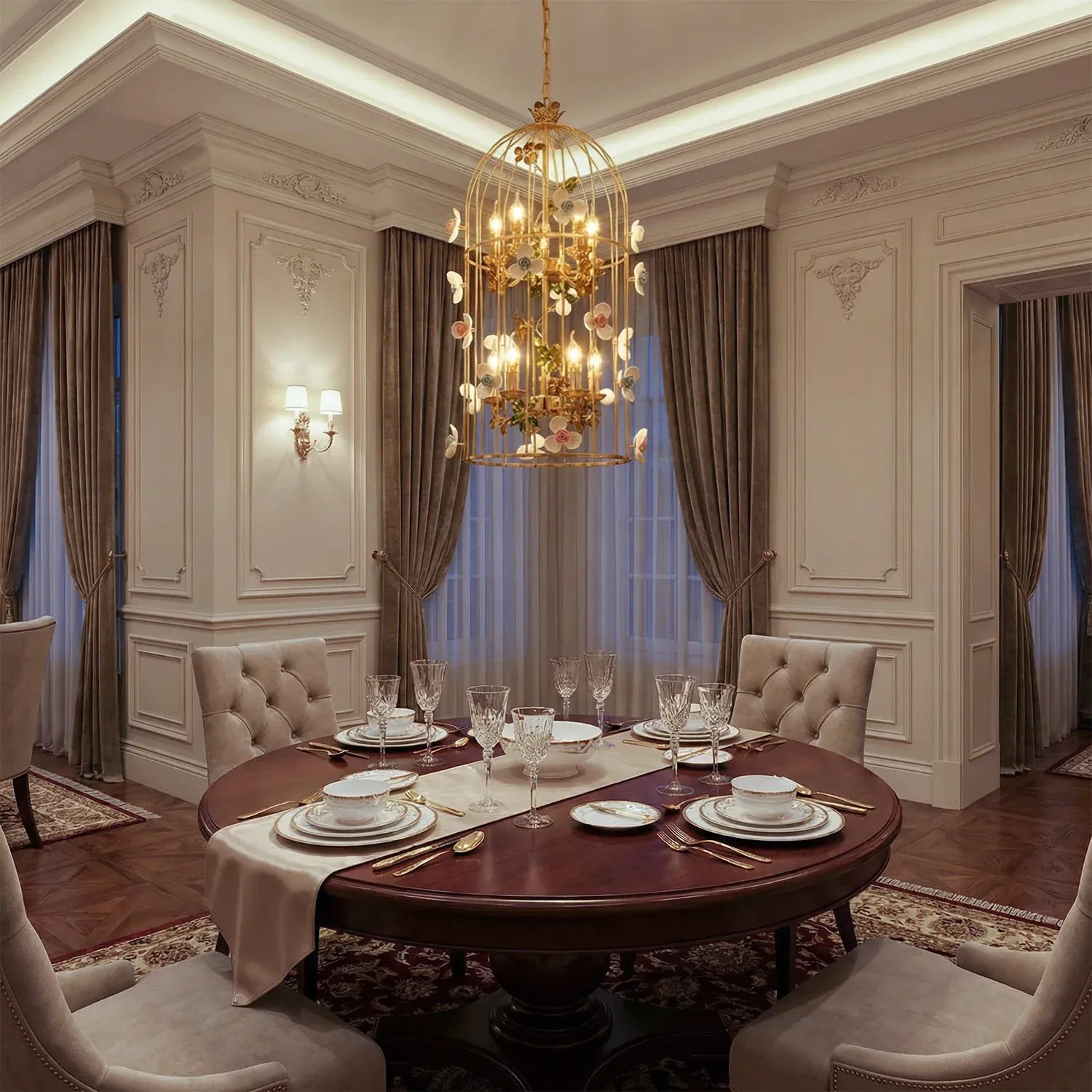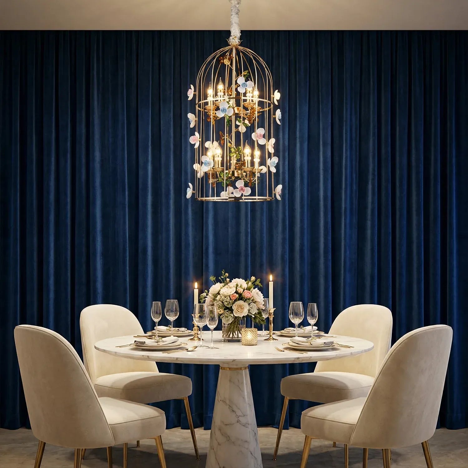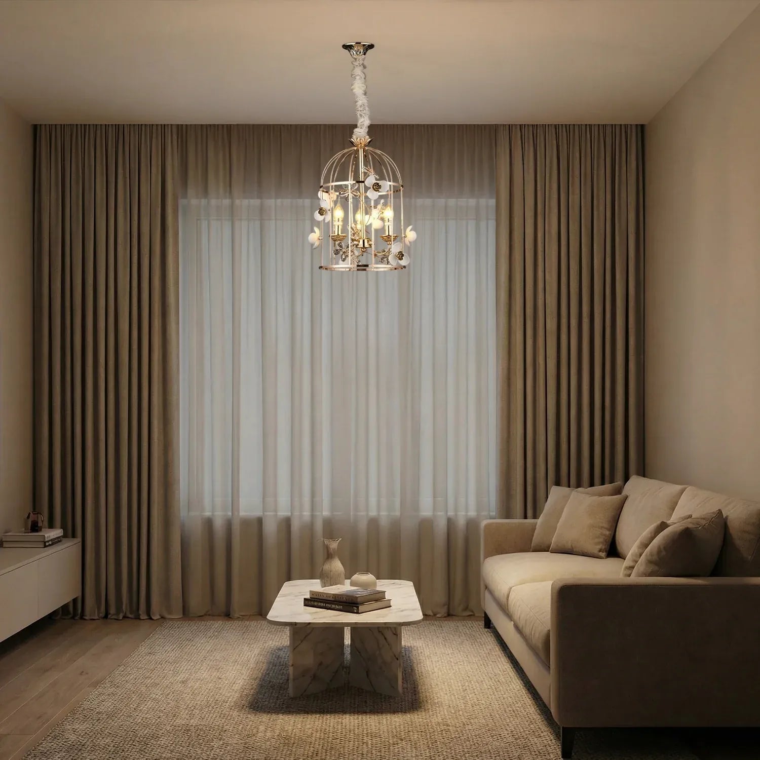 • Elegant birdcage-inspired silhouette that creates a grand statement in luxury interiors.