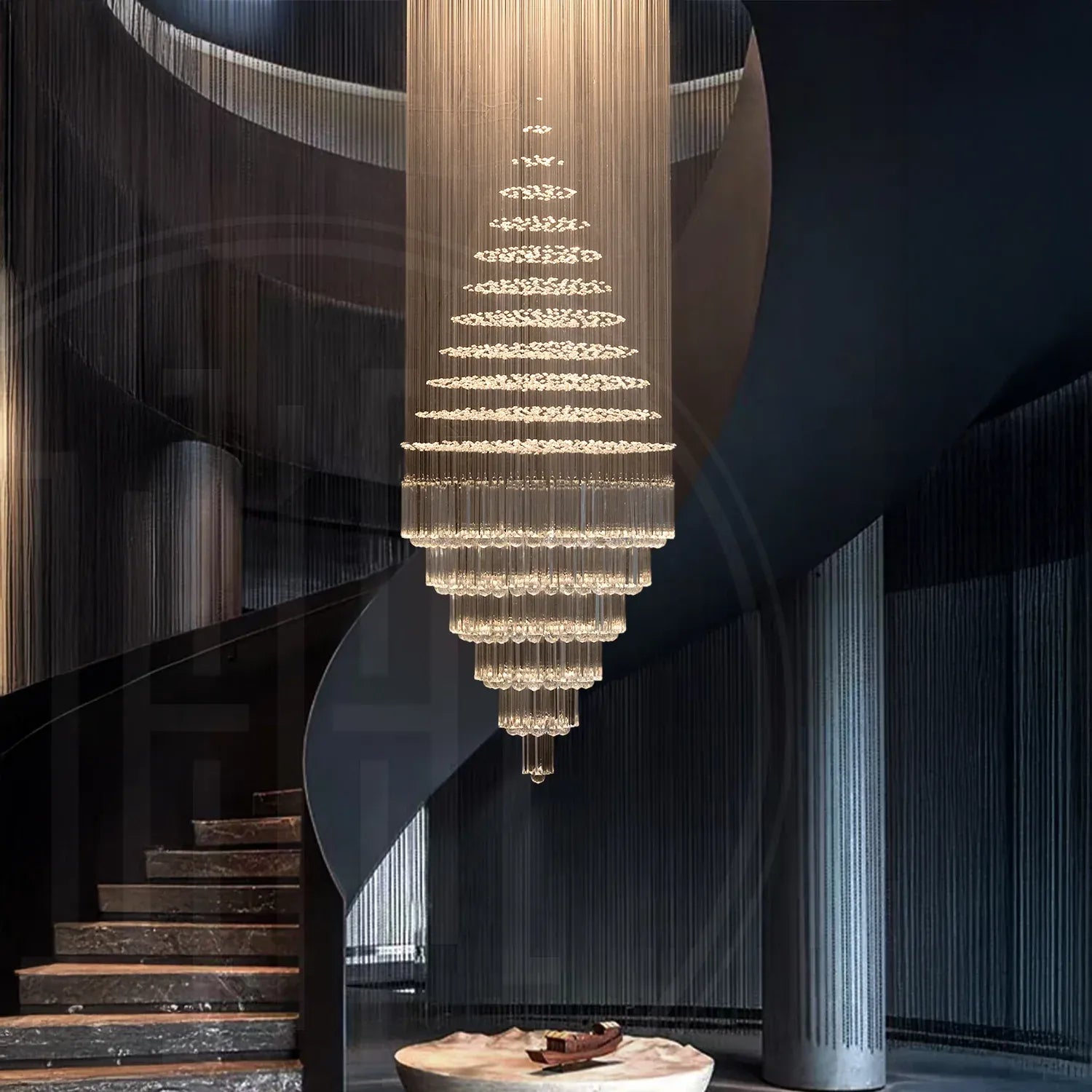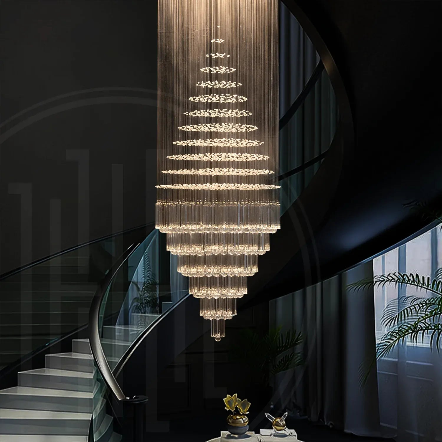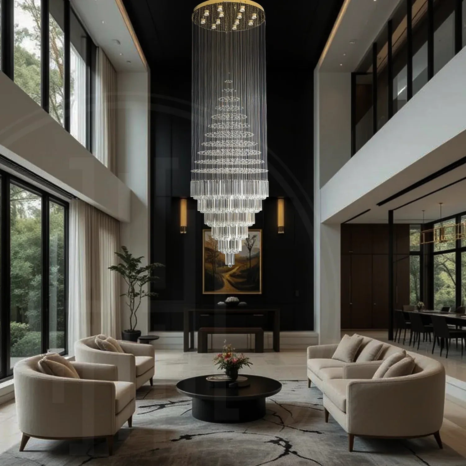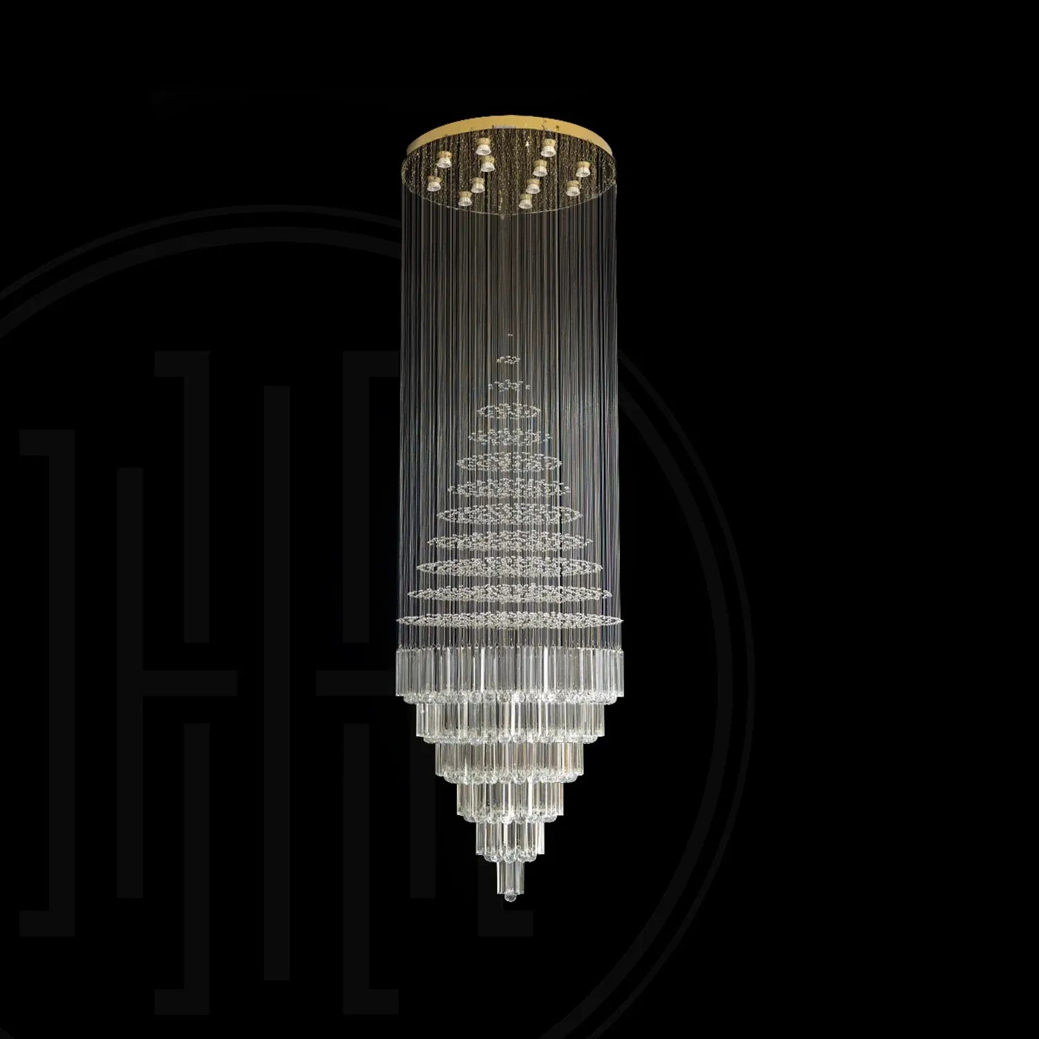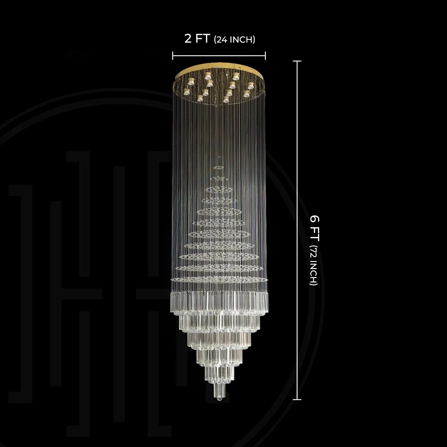 • Long crystal chandelier with a round base for stunning aesthetics.