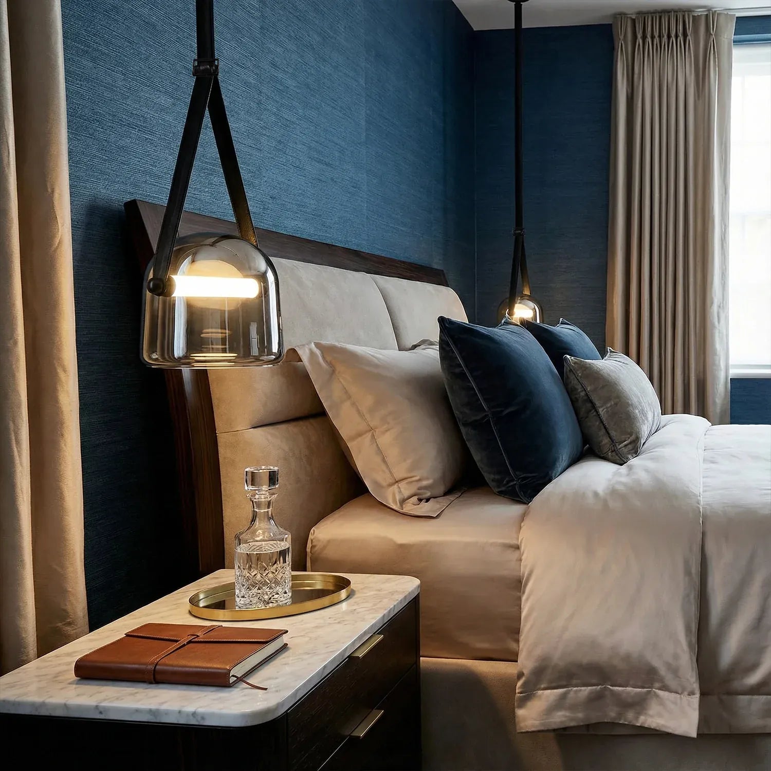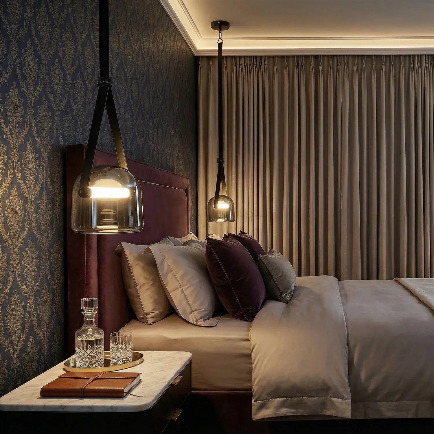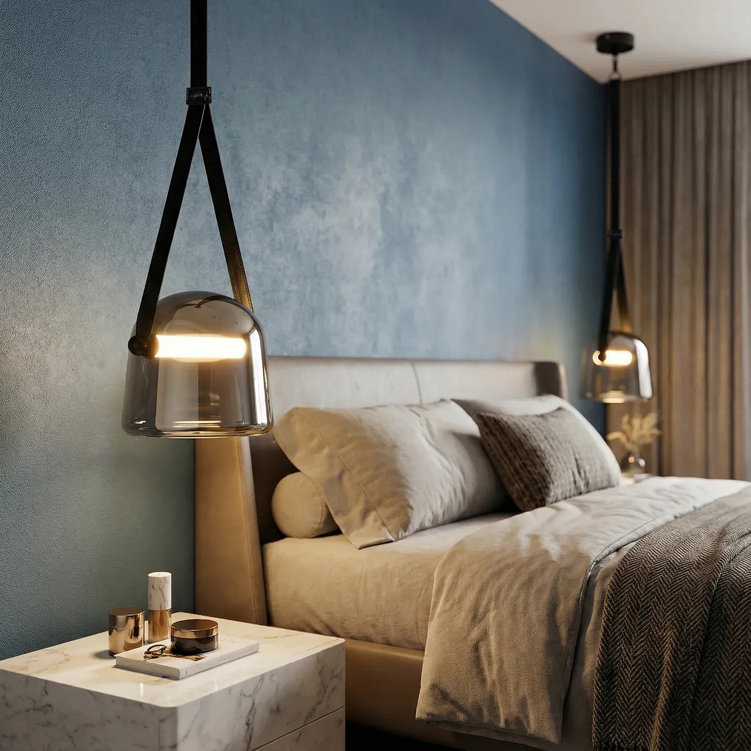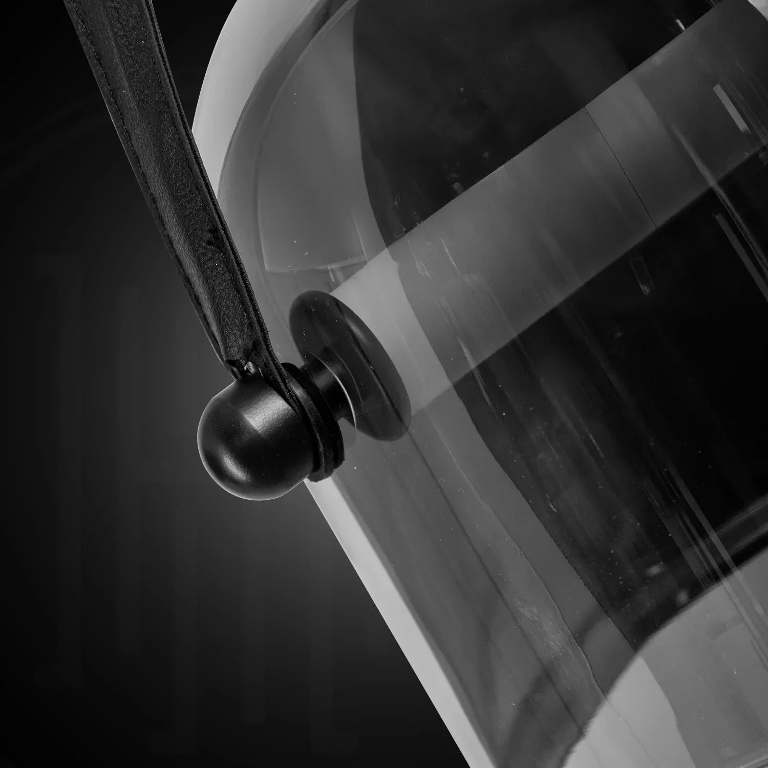 • Contemporary Design: Features a chic dome glass shade suspended by an adjustable leather belt for a unique, modern look.