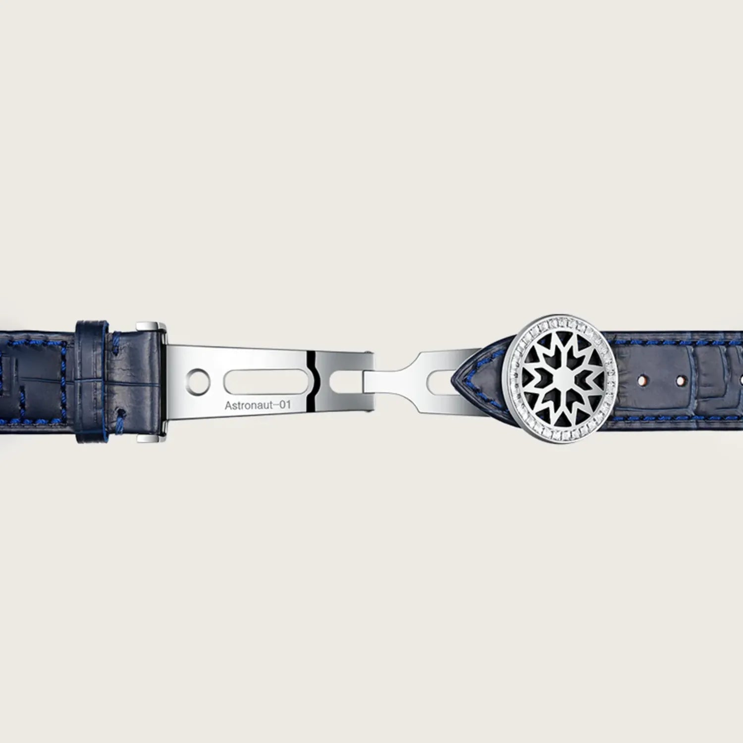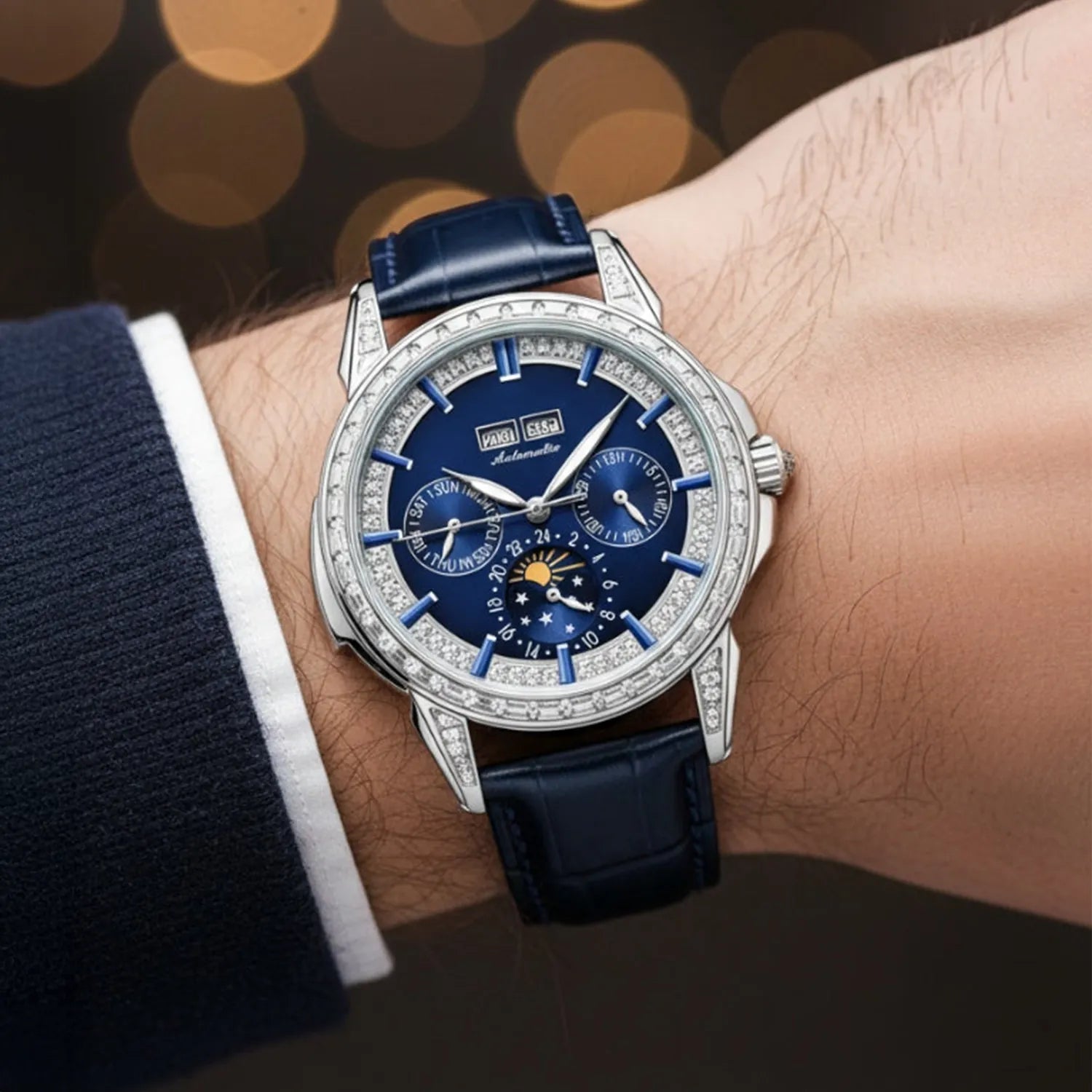 • Deep blue textured calf leather strap adds a bold, sophisticated contrast to the dial
