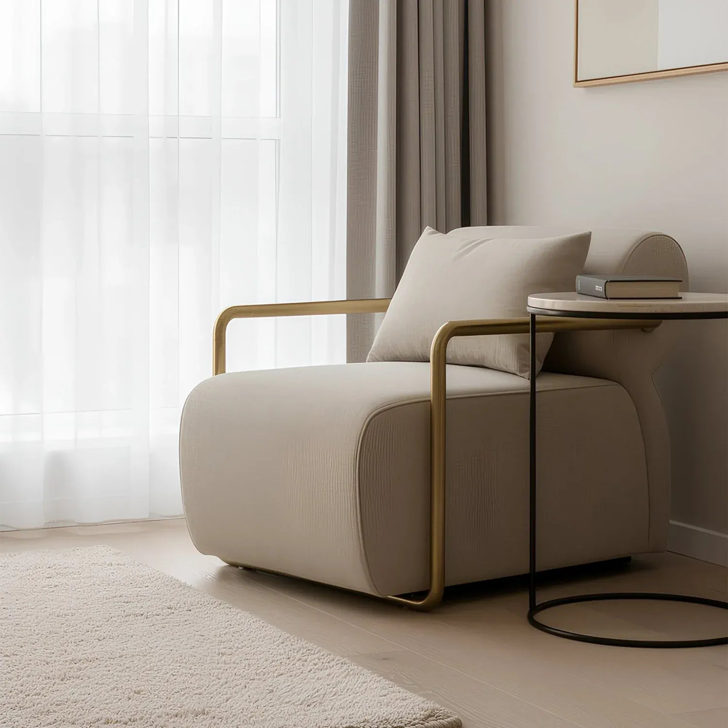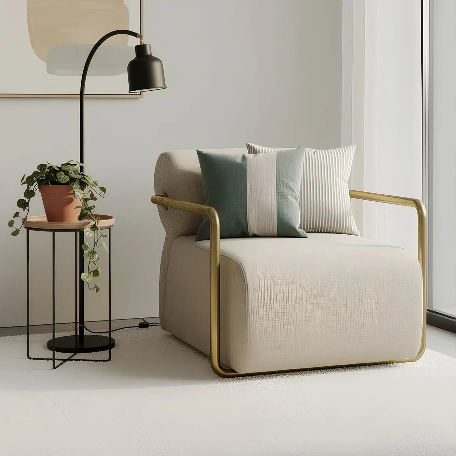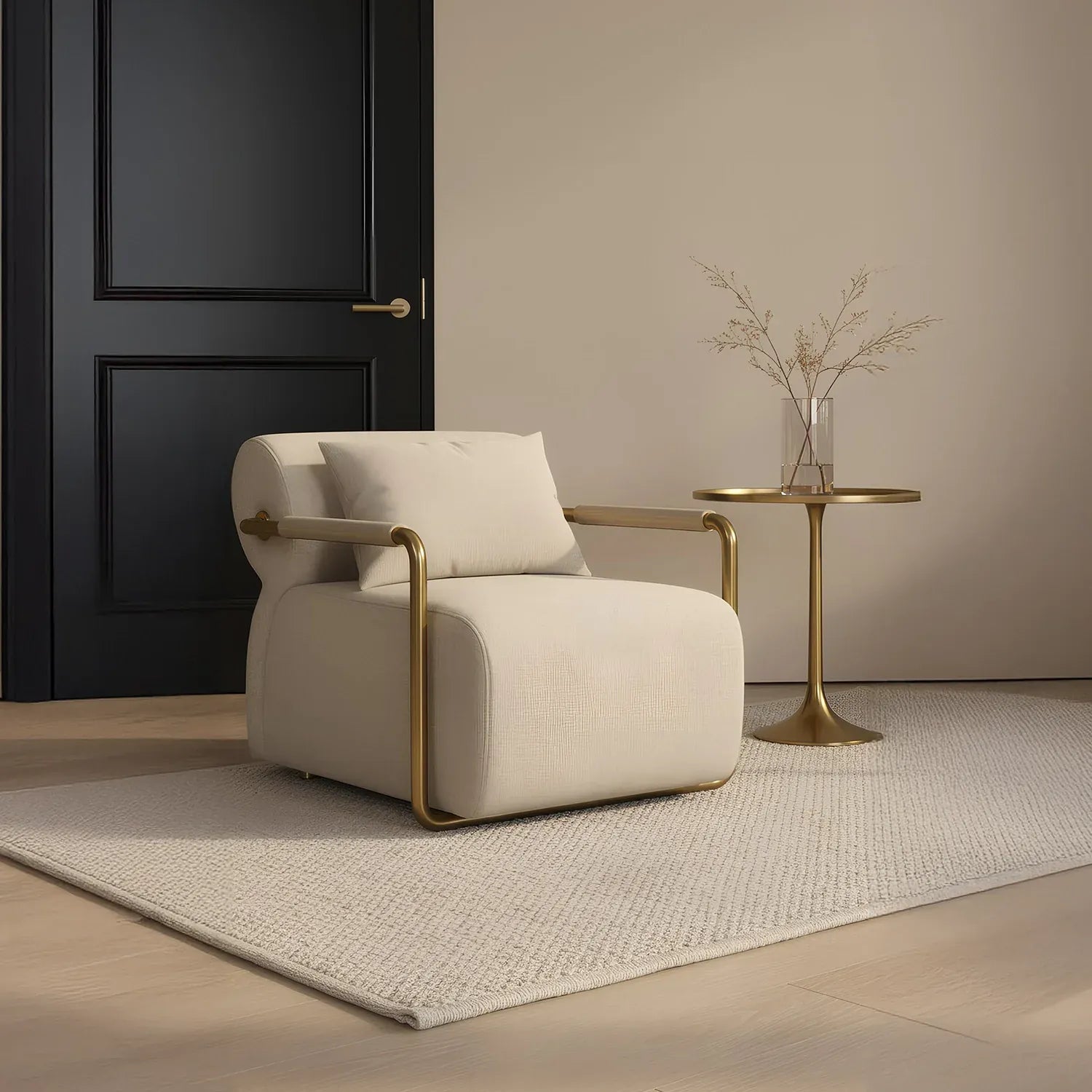 - Elegant Brass-Finished Arm Frame – Sleek metal arm detailing with a refined brass finish adds a touch of understated luxury and architectural appeal.