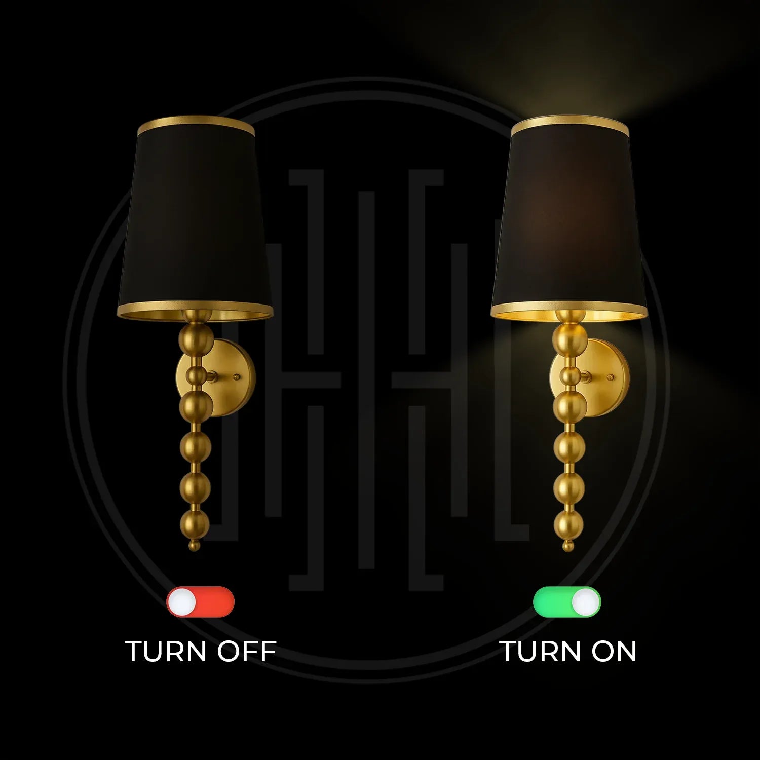 • Modern luxury wall sconce combining matte gold elegance with dramatic black fabric for a bold interior statement.