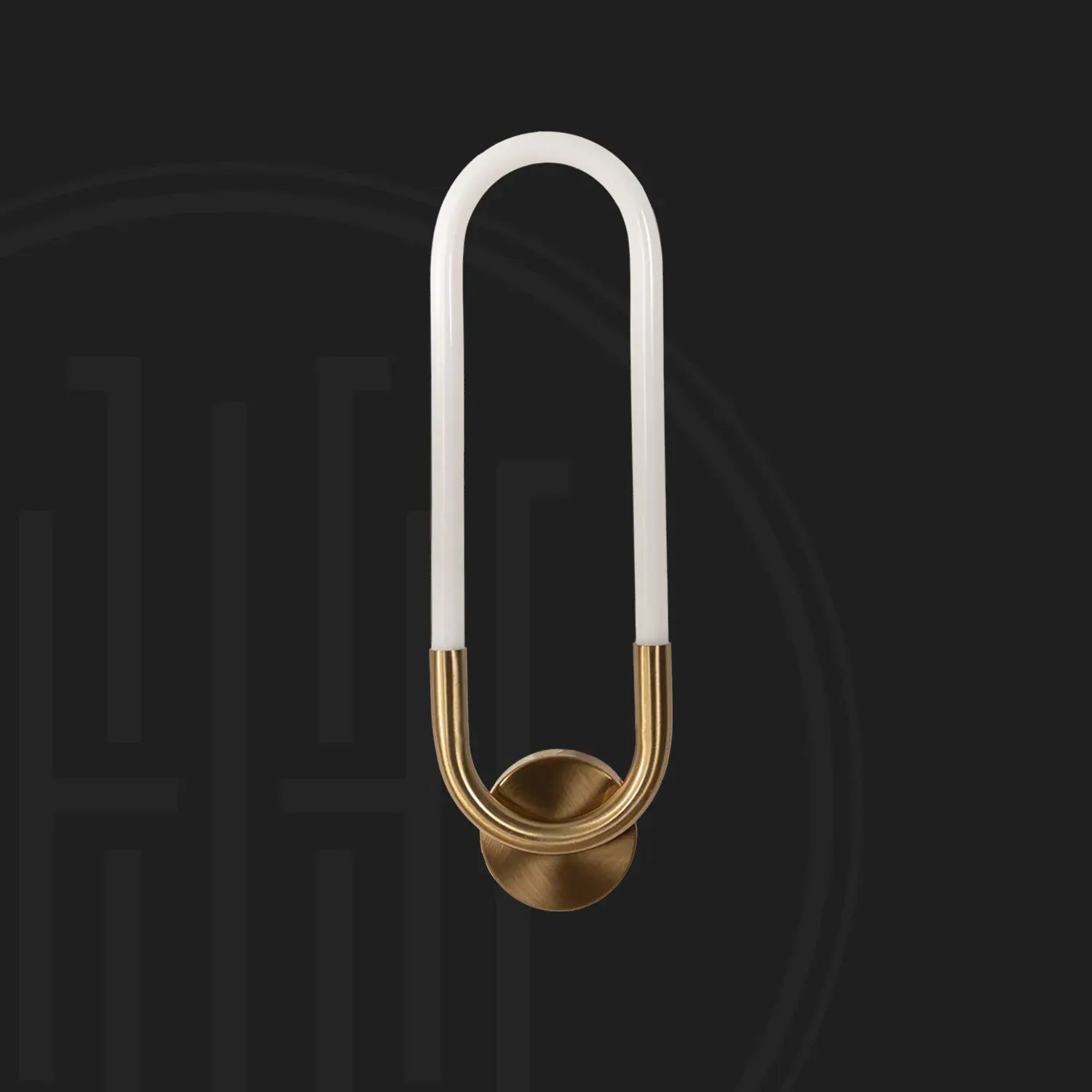 Modern wall sconce in a bedroom setting with a bed and nightstand.